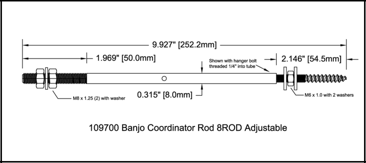 Adjustable rod with M8 x 1.25mm thread on one end, M6 x 1.00mm thread and hanger bolt.