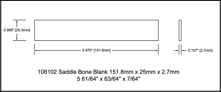 0.107" Thickness (just under7/64" 2.7mm) 0.995" Height (63/64" 25.3mm) 5.975" length (5 31/32" 151.8mm)