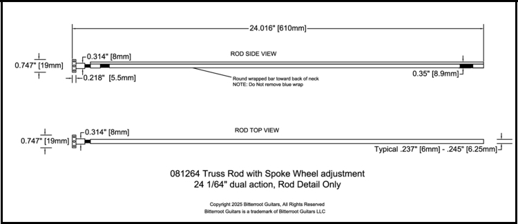 PLEASE NOTE: We recommend you bench test the rod prior to installation in your neck. While we do not have many issues with the performance of this rod, but it is a good idea to check the rod prior to installation. Bench testing can be down by placing each end of the rod in a vise and moving the rod in a normal range of motion and beyond to check the rod. After installation the rod can be very difficult to remove or repair. We test all rods here in the US, but we do suggest this additional step to insure the rod is working correctly prior to placement in the neck.